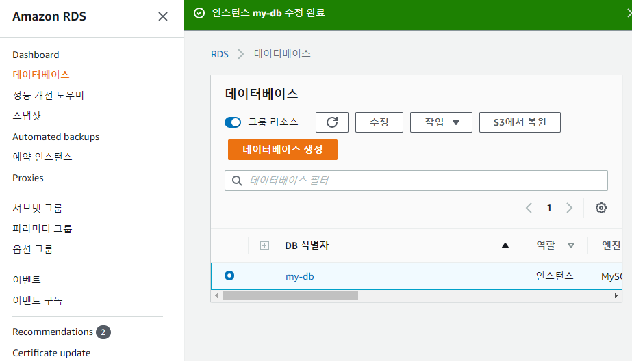 그 후 데이터베이스 수정에 들어가서 파라미터 그룹을 설정해 준다.