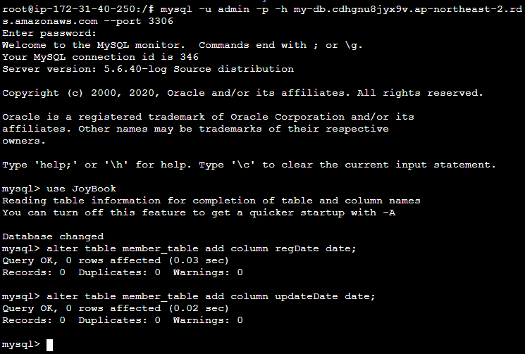 mysql -u admin -p -h {db의 엔드포인트를 복사} --port 3306 명령어로 접속을 하면 정상적으로 생성한 rds에 접속할 수 있고. sql문을 이용하여 데이터 베이스를 만들고 테이블을 만들어서 사용할 수 있다.