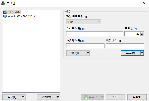 사이트 관리자에서 22번 포트를 설정하고 호스트 이름은 ec2 ip주소이고 사용자 이름은 ubuntu서버의 경우 ubuntu이고 비밀번호를 입력해 준다.