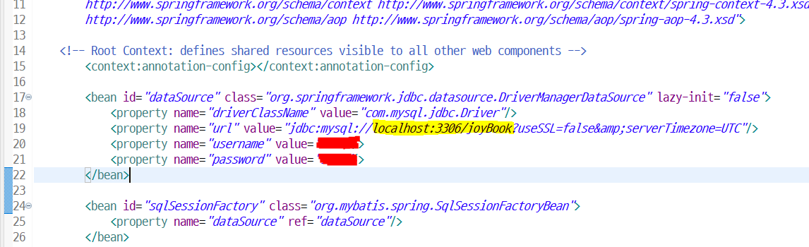root-context.xml 파일에서 저번에 구축한 rds 엔드포인트 주소를 노랑색 위치에 데이터베이스 이름과 같이 넣어준다.