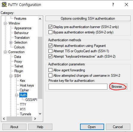 SSH -> Auth 에서 ec2인스턴스의 비밀번호.ppk 파일을 선택해 준다.